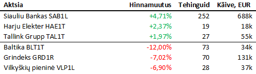 Balti põhinimekirjas tehti reedel 890 tehingut ning käive oli 1,696 miljonit eurot, millest Tallinna börsi käive moodustas 533 tuhat eurot ning Vilniuse börsi käive 991 tuhat eurot. Tehinguid tehti vastavalt 348 ning 447.
