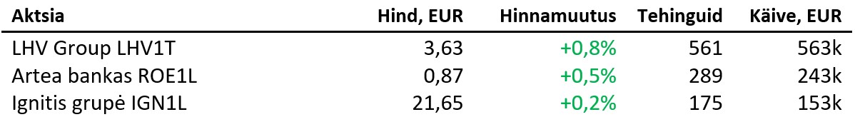 Balti põhinimekirjas tehti kolmapäeval 2793 tehingut ning käive oli 1,927 miljonit eurot, millest Tallinna börsi käive moodustas 1,150 miljonit eurot ning Vilniuse börsi käive 751 tuhat eurot. Tehinguid tehti vastavalt 1638 ning 1027.