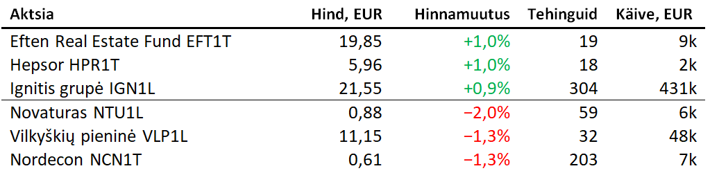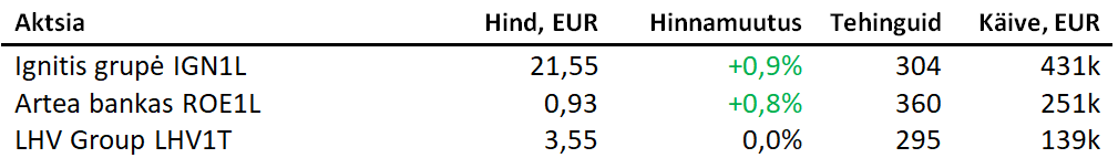 Balti põhinimekirjas tehti neljapäeval 2662 tehingut ning käive oli 1,433 miljonit eurot, millest Tallinna börsi käive moodustas 510 tuhat eurot ning Vilniuse börsi käive 900 tuhat eurot. Tehinguid tehti vastavalt 1424 ning 1117.