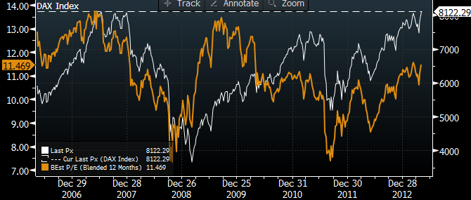 DAX on külla kauplemas kõrgeimal tasemel oma ajaloos, kuid kui suhestada seda indeksisse kuuluvate firmade järgmise 12 kuu ettevaatavate kasumitega, siis 11,5x jääb alla tasemetele, millel kaubeldi enne kriisi.