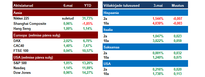Olgugi, et USA majandus (ja paljude teiste riikide / regioonide omad samuti) on viimastel kuudel kogenud majanduskliima jahtumist, siis tagantjärgi tarkusena võib ehk väita, et üks indikaator, mis ehk reetis kardetust paremat tööjõuraportit, on olnud töötu abiraha taotluste stabiilne langus pärast lihavõttepühasid. S&P 500 kerkis NFP najal protsendi jagu rekordilise 1614,4 punktini. Stoxx 600 lõpetas samuti 1,1% plussis, kõrgeimal tasemel alates 2008.a suvest. Tugevam oli Saksamaa DAX, millel õnnestus 2%ga uue rekordini jõuda.