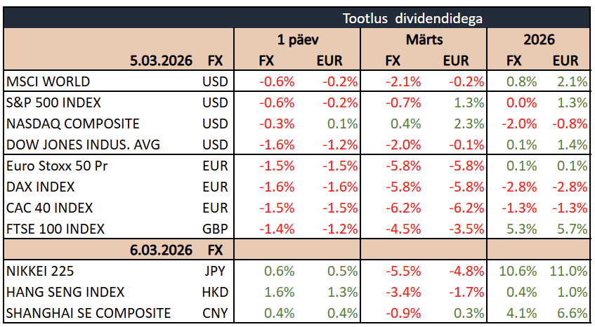 USA aktsiaturud lõpetasid neljapäeva langusega, kuna Iraani konflikti eskaleerumine kergitas nafta hinda, süvendades hirme nii inflatsiooni kiirenemise kui ka globaalse majanduskasvu aeglustumise ees. Dow Jones taandus 1,8%, S&P 500 langes 0,8% ja Nasdaq 100 0,6%. Müügisurve koondus eelkõige tsüklilistesse sektoritesse, kus tööstus- ja materjaliettevõtted olid nõrgemate seas, sest kõrgemad energiahinnad suurendavad sisendkulusid ja survestavad kasumimarginaale.