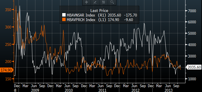 Eelmisel nädalal vähensid USA kinnisvaralaenude taotlused eelneva nädalaga võrreldes -8%. Refinantseerimist kajastav indeks (valge) langes -8% ja uute hüpoteeklaenude väljastamise indeks (oranž) alanes nädalaga -5% madalaimale tasemele alates 2012.a detsembrist. Seega intresside langus laenuturul on tulnud kasuks just refinantseerimiste elustamisel, mitte aga niivõrd uute laenude võtmisel.