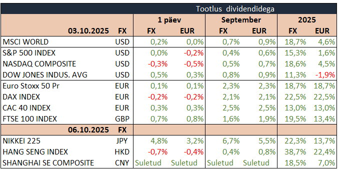 USA börsiindeksid jätkasid reedel tõusu, hoolimata sellest, et valitsuse tööseisak oli kestnud juba kolmandat päeva. S&P 500 tõusis 0,5% ja Nasdaq lisas 0,3%, saavutades uue sulgemisrekordi. Turgudel valitseb veendumus, et tööseisaku majanduslik mõju jääb tagasihoidlikuks ja et Föderaalreserv jätkab intressimäärade langetamise tsükliga. Kuigi valitsuse tööseisak on toonud kaasa viivitusi oluliste makromajanduslike andmete, sealhulgas septembri töötururaporti avaldamise osas, on turuosaliste fookus liikunud erasektori poolt avaldatud majandusnäitajatele, mis viitavad tööjõuturu jahtumisele ning tugevdavad lootust uuele intressikärpele veel selle kuu jooksul.