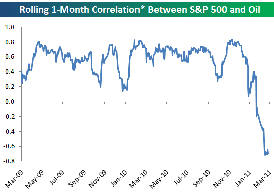 Bespoke on välja toonud joonise korrelatsioonist S&P 500 ja nafta hinna vahel alates aktsiaturgude põhja moodustamisest 2009. aasta 9. märtsist. Nagu näha, siis aktsiaturu ja nafta hinna vahel valitses kuni viimase ajani valdavalt keskmine või tugev positiivne korrelatsioon ehk nafta hindade tõustes tõusid ka aktsiahinnad. Praegu on seos aga vastupidine ehk tugevalt negatiivne, korrelatsioonikordaja on -0.7. Seega hakkas aktsiaturgudele nafta hind muret valmistama $90 juures.