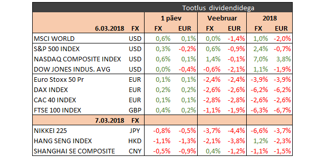 Finantsturgude fookus püsib täna tõenäoliselt USA võimalikel imporditarfiifidel ning vastust otsitakse ka küsimusele, kellest saab Trumpi järgmine majandusnõunik. Makrouudistest võiksid suuremat tähelepanu pälvida USA ADP tööturu veebruari küsitlus ning USA jaanuari kaubavahetuse statistika.