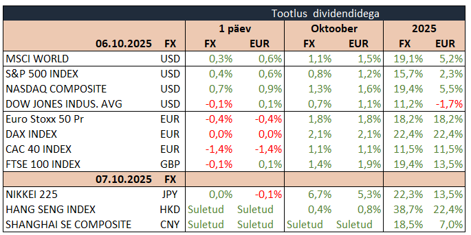 Hoolimata USA valitsuse tööseisaku jätkumisest, mis on nüüd kestnud teist nädalat ja tekitanud viivitusi tähtsate makroandmete, sealhulgas töötururaporti avaldamise osas, keskenduvad investorid pigem tugevatele ettevõtete väljavaadetele ja Föderaalreservi potentsiaalsetele intressikärbetele. CME FedWatchi andmetel ootab turg endiselt 95% tõenäosusega uut intressikärbet oktoobris.