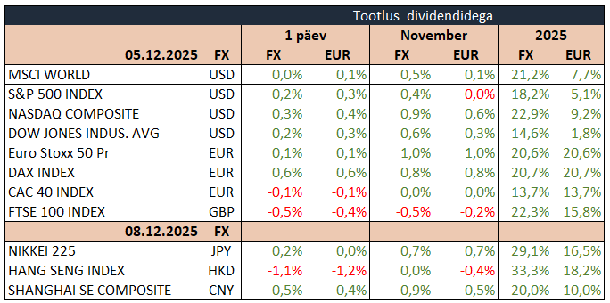 USA aktsiaturud lõpetasid nädala positiivselt, kui S&P 500 kerkis 0,2%, Nasdaq lisas 0,4%. Meeleolu toetasid ootuspärane inflatsiooniandmete tulemus ning tugevam tarbijate kindlustunde näit, mis suurendas turu ootusi Föderaalreservi detsembrikuisele intressikärpele, mille tõenäosuseks hinnatakse nüüd umbes 87%.
