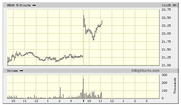 ARUN avanes täna väga kõrgelt, mis rikkus avanemisjärgse reaktsiooni natuke ära. Aktsia avanes $ 22,47 pealt ehk 5,5% kõrgemalt ning kukkus peale avanemist alla $ 22 taseme. Hetkeks on aktsia küll tugevalt taastunud ja kaupleb taas oma avanemistasemete juures ehk $ 22,41 kandis, 5,2% plusspoolel.