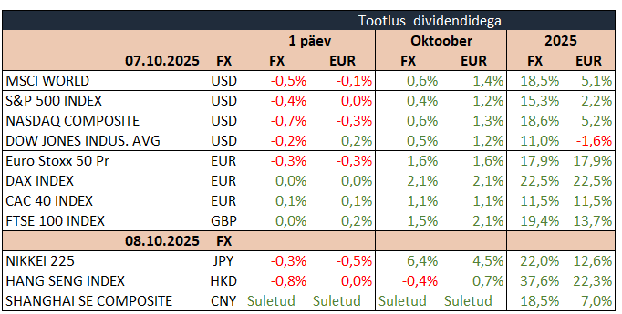 Aasia turud liikusid öösel erisuunaliselt, kuid Jaapani Nikkei tõusis taas rekordtasemele. ASX200 langes 0,1%, Hang Seng tuli allapoole 0,8%, kuid Kospi kerkis 2,7%. Brenti toornafta kallines 0,8% 66,0 dollarile, Bitcoin langes 2,4% 121 386 dollarile ning Ethereum kukkus 5,4% 4449 dollarile. EUR/USD nõrgenes 0,4% 1,1610 dollarile. Euroopas mõjutas sentimenti negatiivselt Prantsusmaa peaministri ootamatu tagasiastumine, mis suurendas poliitilist ebakindlust regioonis.