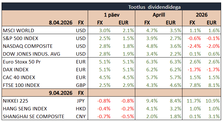 USA aktsiaturud lõpetasid kolmapäeva tugevas tõusus, kui kahe nädala pikkune relvarahu USA ja Iraani vahel parandas märkimisväärselt investorite meeleolu. Dow Jones hüppas enam kui 1300 punkti ehk 2,85%, tehes parima päeva alates 2025. aasta aprillist, samal ajal kui S&P 500 kerkis 2,5% ja Nasdaq 2,8%. Turu rallit toetas lootus, et relvarahu aitab rahustada energiaturge ning vältida ulatuslikumat lööki majandusele.