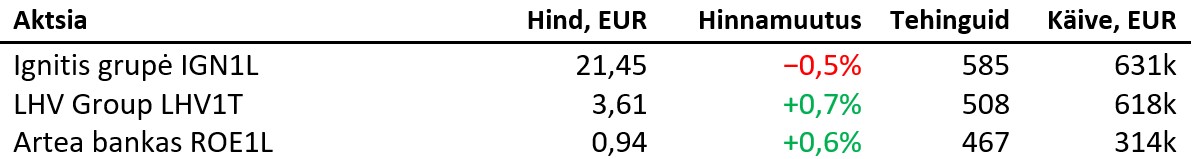 Balti põhinimekirjas tehti kolmapäeval 4469 tehingut ning käive oli 2,725 miljonit eurot, millest Tallinna börsi käive moodustas 1,371 miljonit eurot ning Vilniuse börsi käive 1,251 miljonit eurot. Tehinguid tehti vastavalt 2299 ning 1874.