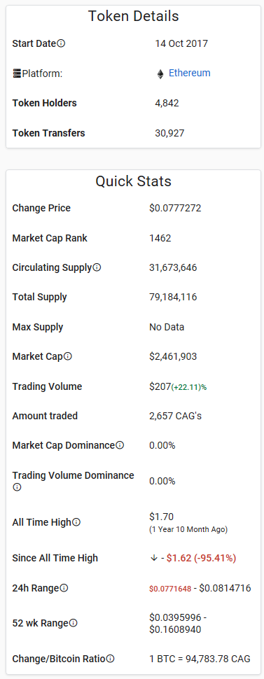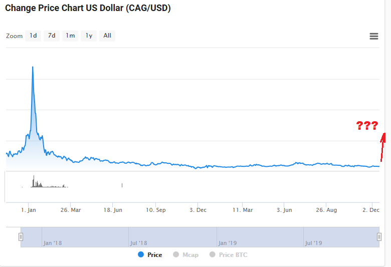 Ringluses on ca 31,7m coini. Järelikult peaks CAG/USD väärtus olema 20m EUR turuväärtuse korral ca 22,2m USD ehk ca 0.70 USD per coin. Praegu on hind aga 0.077272 ehk ca 10x väiksem. (kui müntide arvuks võtta mõõdik total supply 79,184,116, siis ühe mündi hind peaks olema ca 1/2 väiksem, ehk ca 0.35 USD)
