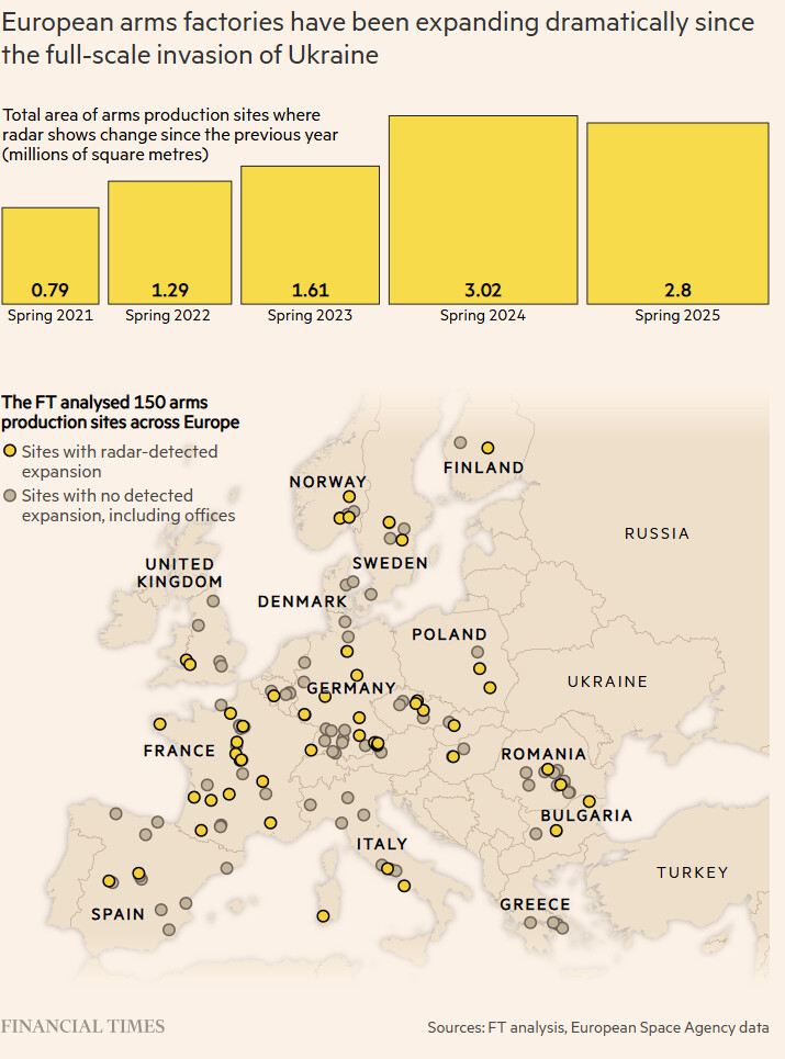 Europe’s weapons factories are expanding at three times the rate of peacetime, stretching over 7mn sq metres of new industrial development that represents rearmament on a historic scale.
