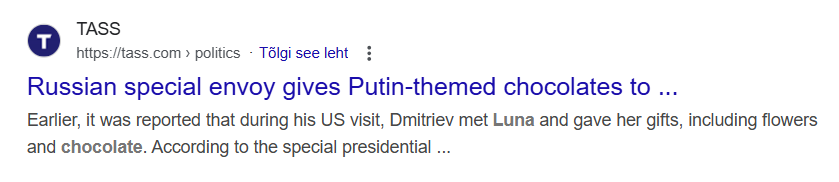 Tass(Veremaa propakanal) näitab rõõmuga, kuidas Veremaa eriesindaja(Kirill Dmitriev, Putini tütre parima sõbranna abikaasa, Putini lähiringi inimene) esindaja kohtub pärast Trumpilt esimeste tõeliste sanktsioonide saamist USA kongressi esindaja, Anna Paolina Lunaga. Kohtumine oli Veremaa propale jälle tõeline maiuspala. USA esindajale anti lilled, meelitused, komplimendid ja spetsiaalne, Putini nn. erisoovidega shokolaad. https://www.youtube.com/watch?v=jWEAZF9mNwc