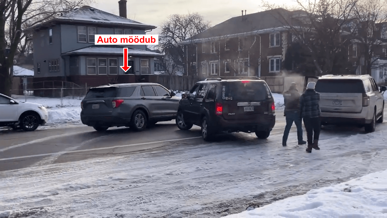 Auto jätkab surmavalt haavatud juhiga teekonda ja põrkab mõnikümmend meetrit eemal teisel pool tänavat parkivate autode otsa, mis tugevast löögist edasi liiguvad: