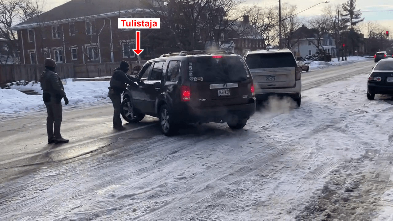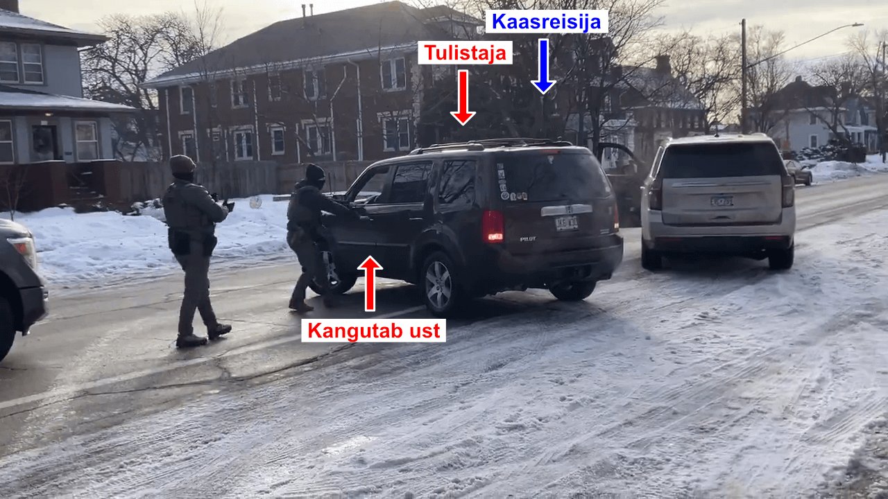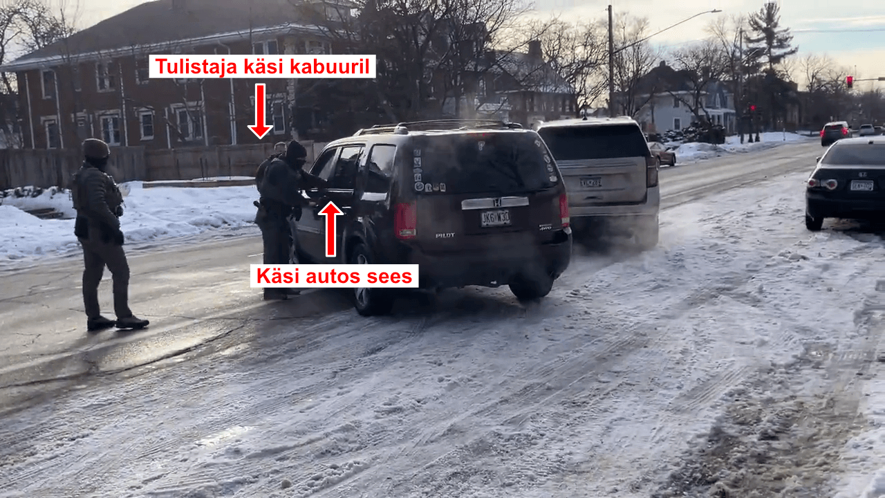 Uks kangutamise peale ei avane, kangutaja pistab käe läbi avatud akna autosse ja üritab seest avada. Auto tagurdab, tagurdamise jooksul liigub tulistaja auto küljelt auto ette ja vahetab telefoni vasakust käest paremasse: