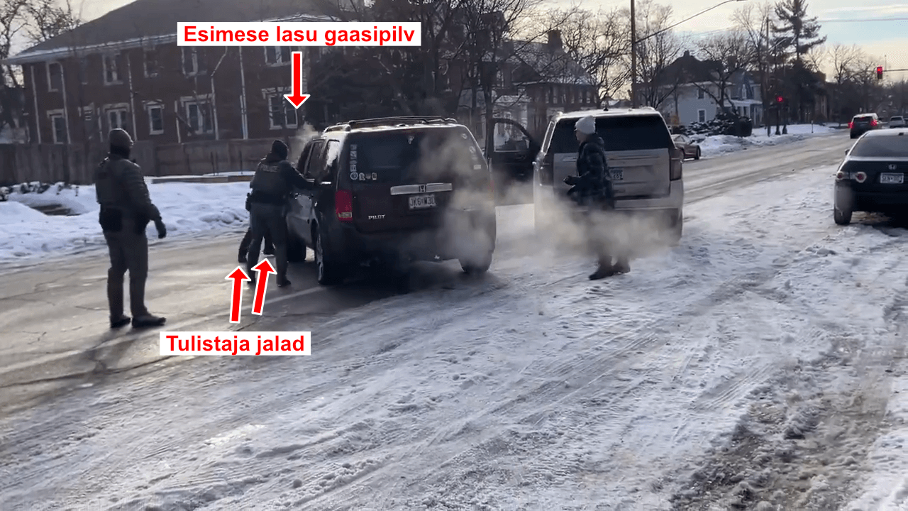 Esimesest lasust kerkib hetkega selge gaasipilv. Tulistaja jalad on sel hetkel auto kõrval ja selgelt eemal auto liikumisvektorist (pööre paremale):