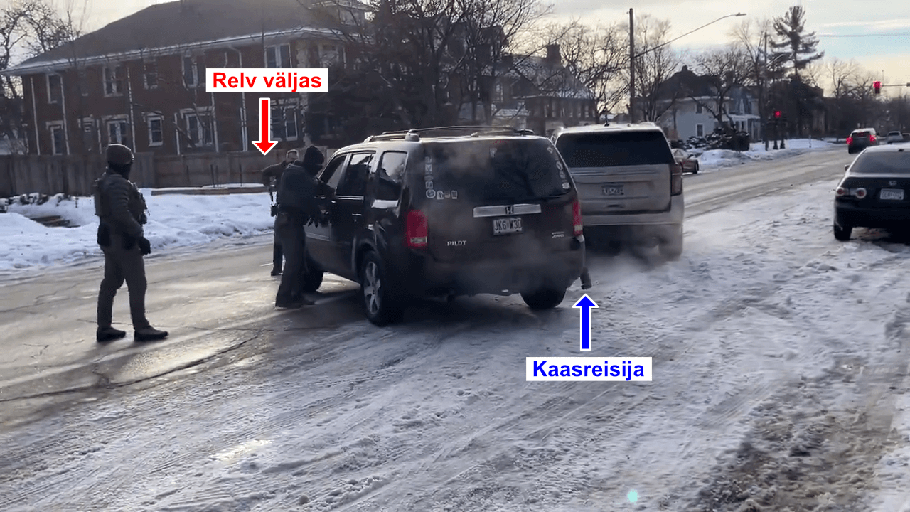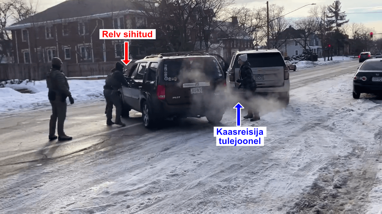 Neljandaks, teenimatult vähe on tähelepanu saanud, et tulistamisega pandi ohtu auto kõrvale välja tulnud kaasreisija, kes hetk tagasi oli tulistajaga kõnelenud. See kaader, kuidas auto ühest esinurgast tulistatakse tahtmatult diagonaalselt vastasnurgas seisva isiku suunas, on õpikunäide, miks relva kasutamine on neis olukordades viga: juht tapeti ja kõrvalseisja pandi ohtu, aga eesmärki ei saavutatud, sest auto ei jäänud seisma.