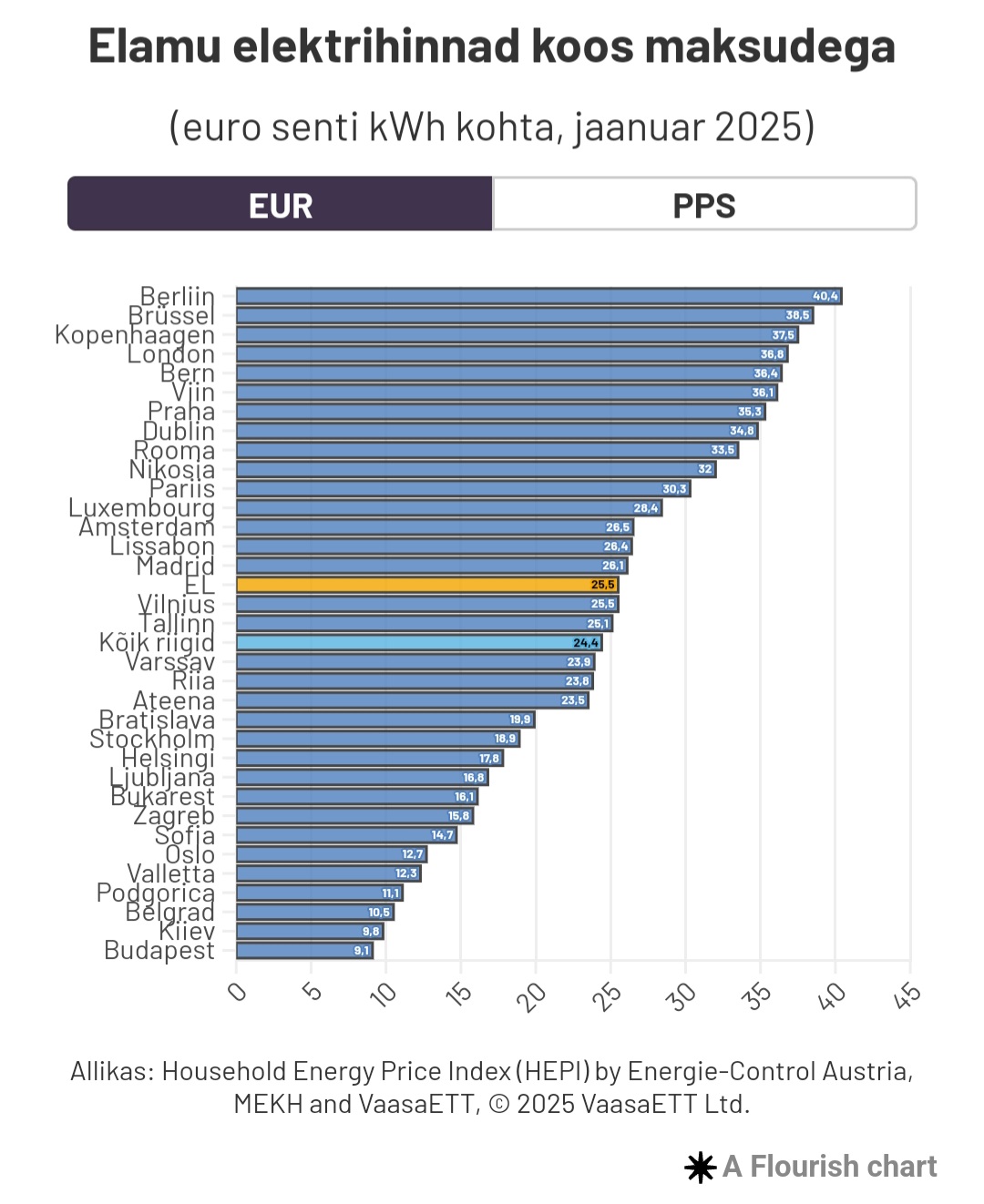 - aasta 3. jaanuari seisuga olid eramajade lõpptarbijate elektrihinnad Euroopas väga erinevad. Madalaim hind oli 9,1 senti/kWh Budapestis, kõrgeim aga 40,4 senti/kWh Berliinis. Euroopa liidu keskmine elektrihind oli 25,5 senti/kWh.