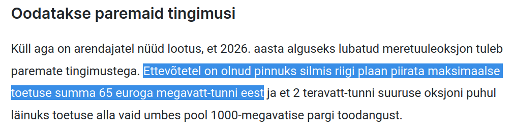 Isegi 65€/MWh (6,5s/kWh) toetust oli ahnepäitsadele vähe, loodavad uuel aastal veel kõrgemat toetuse määra. Isegi see 6,5 ei ole ju mingi odav ega kogu hinna tooja. See jama tuleks nüüd jaigavesti maha matta.