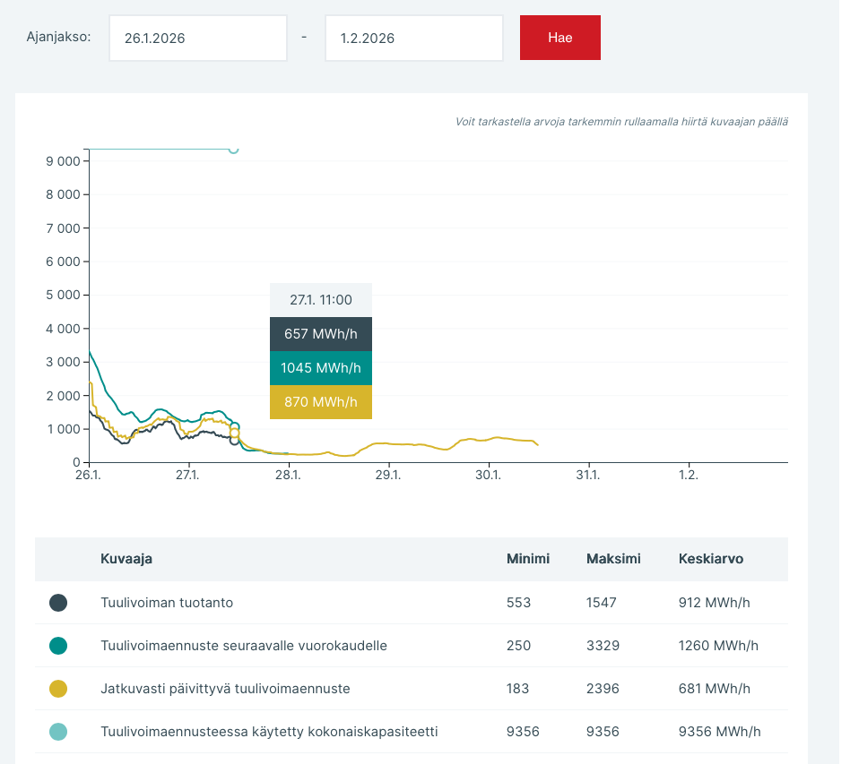 Hetkel (27.01.2026 kell 11:00) on Soomes tuulest elektritoodang miski 657MW/h. Suurusjärguliselt sama palju, kui on hetkel kogu Eesti elektritootmine. Tõsi, seda on ainult umbes 7% kogu Soomes installeeritud tuulikute maksimaalsest tootmisvõimsusest.