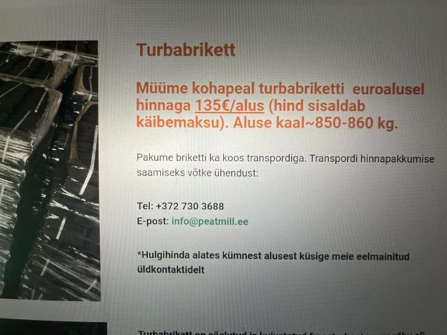 Müüme kohapeal turbabriketti euroalusel hinnaga 135€/alus (hind sisaldab käibemaksu). Aluse kaal~850-860 kg. https://www.peatmill.ee/toode/