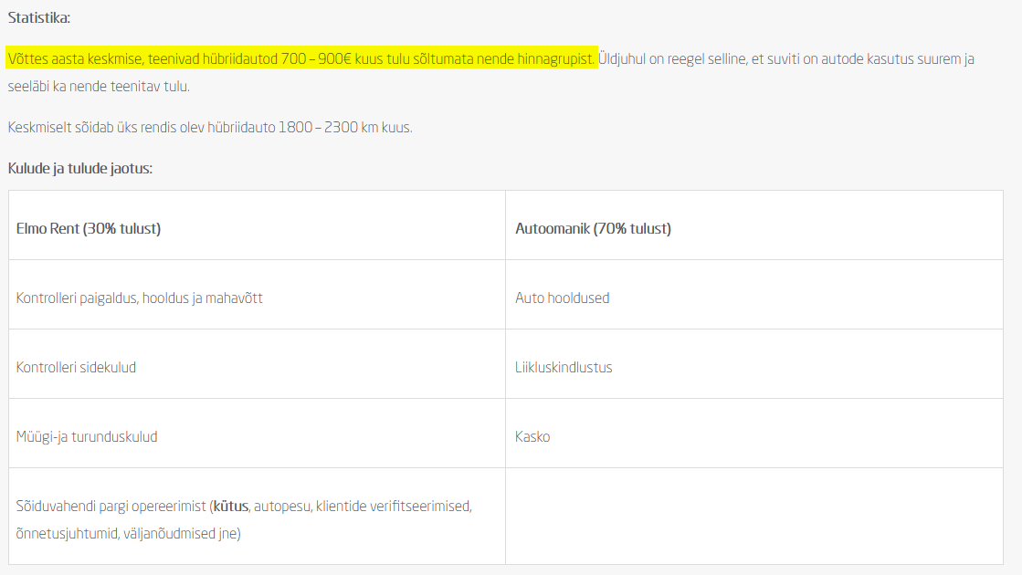 Ei ole sellist mudelit, et ostan auto (kaptalimahukas) ja üürin sejärel välja (vähe ja aeglane tulu).