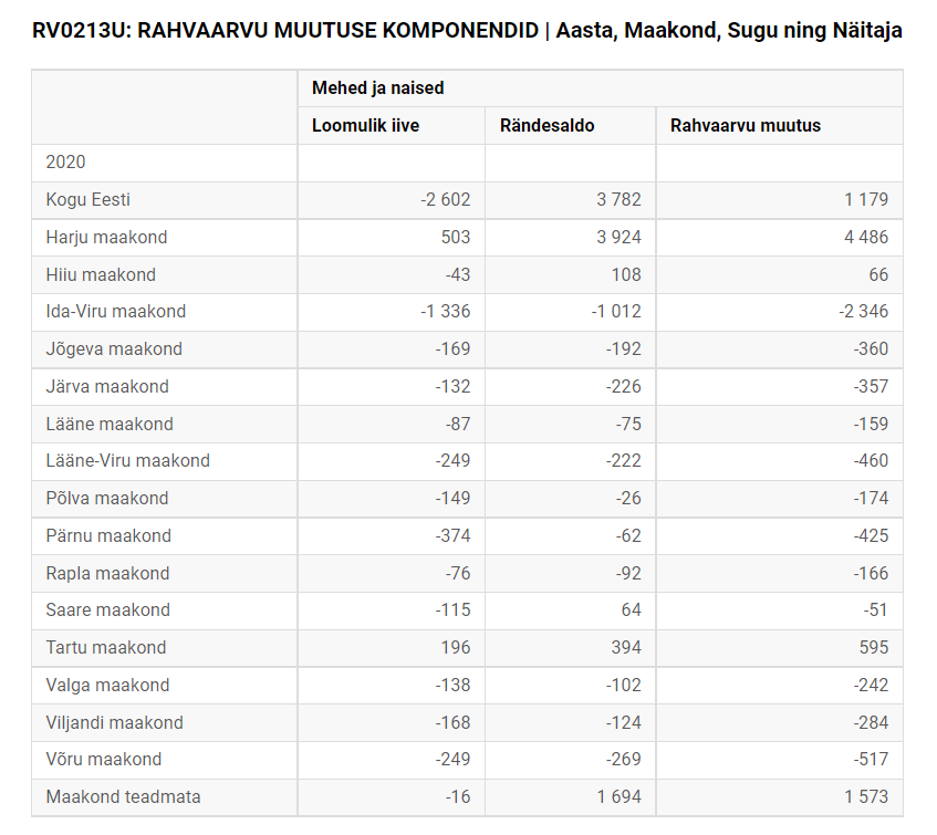 Siin rändenumbrid ka. Rändesaldo täiendus rahvaarvule on ootamatult suur, kuigi oletan, et sisseränne kasvatab pigem pealinna elanike arvu ja loomulik iive kahandab väiksemate maakondade oma, kus rahvastik on eakam ja lapsi sünnib vähem. See tähendab, et need kaks protsessi koosmõjus kiirendavad inimeste ja majanduse koondumist Tallinnasse/Harjumaale veelgi.