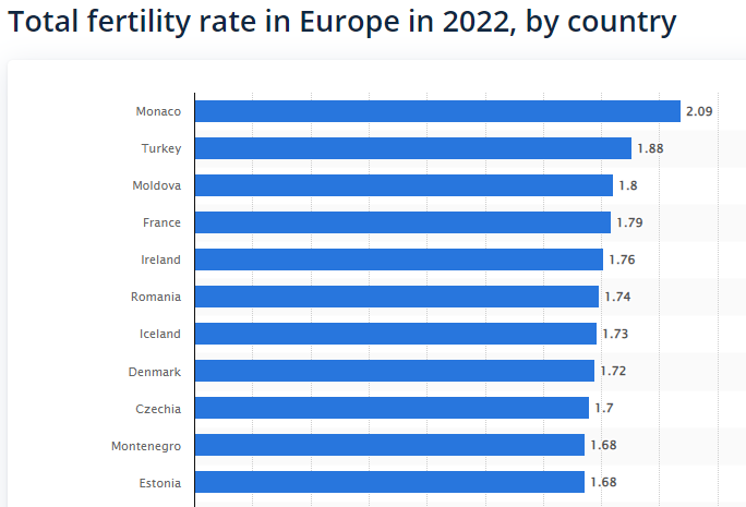 Kui Monaco kõrvale jätta, siis ülejäänud Euroopa riigid surevad välja. Ja ei pööra mingid peretoetused siin asja peapeale. Oluline on eestikeelne haridussüsteem ja eesti keele positsioonide kaitse laiemalt. Assimilatsioon (segapered jne - lapsed kasvatada eestlasteks). https://www.statista.com/statistics/612074/fertility-rates-in-european-countries/