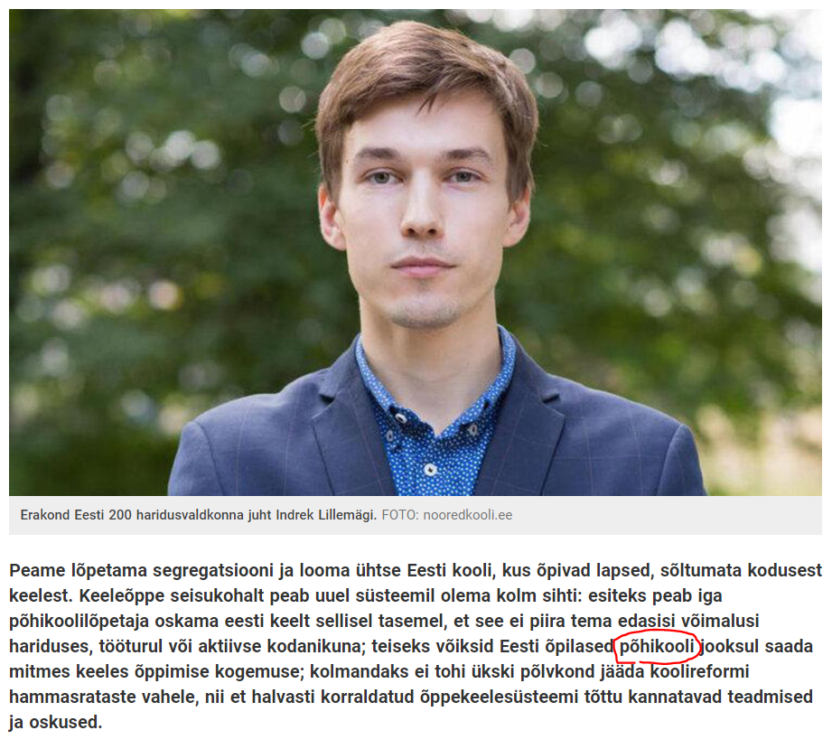 Kui nüüd see kokku võtta, siis räägitakse ikkagi enamuses eestikeelsete õpilaste põhikoolis mõne baasaine vene keeles õppima panekust. Seda räägib "Erakond Eesti 200 haridusvaldkonna juht Indrek Lillemägi."