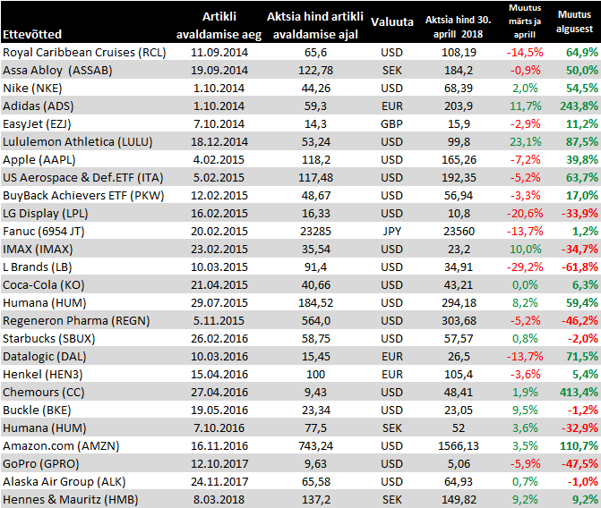Amazonilt arvatust paremad Q1 tulemused ning teise kvartali ärikasumi väljavaade. Ettevõtte peamise kasumiallika AWSi käibe kasv kiirenes neljanda kvartali 45% pealt 49%le, ning "other" alla käiv reklaamitulu 60% pealt 132%le (Morgan Stanley kohaselt oli segmendi kasv 73% ilma raamatupidamisliku kasuta). Lisaks teatati USA Prime teenuse aastase tasu tõstmisest 20 dollari võrra 119 dollarile, pakkudes selle eest suuremat juurdepääsu meediatoodangule ja laiendades ka kahepäevase tarnega kaupade valikut.