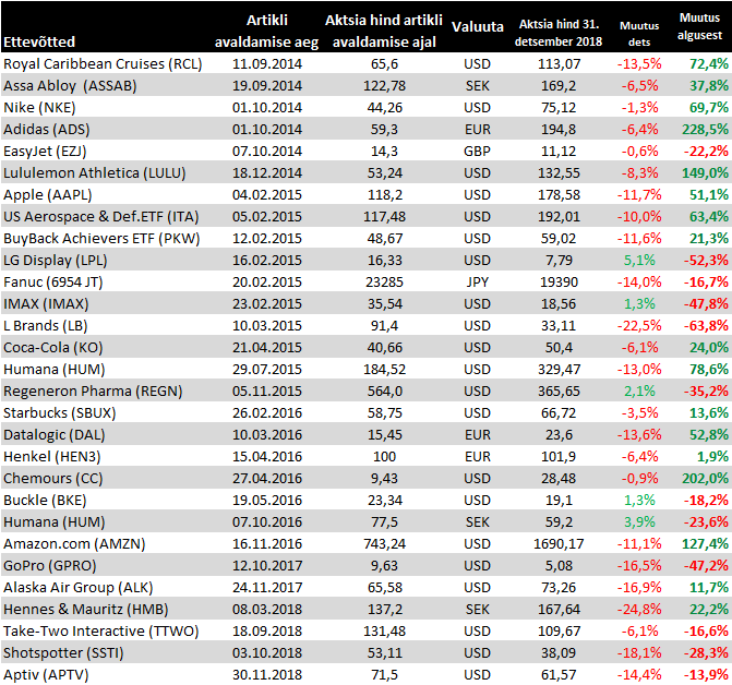 H&Mi neljanda kvartali müük oli juba varasemalt teada, täna avaldatud kasuminumber valmistas aga oodatust nõrgema marginaali tõttu pettumuse. Allahindlused küll vähenesid eelneva aasta sama perioodiga võrreldes, ent täiendavaid kulusid tekitasid logistika väljavahetamisega ning ettevõtte ümberpööramisega seotud kulud. Varude tase küll alanes kvartaliga veidi, kuid 17,9% osakaaluna müügist püsib endiselt väga kõrgena (firma eesmärgiks on 12-14%). Dividend jäeti eelmise aasta tasemele ning tegevjuhi sõnul on senised sammud näitamas positiivseid tulemusi. Jooksva kvartali esimese kahe kuu müük kasvas 4%
