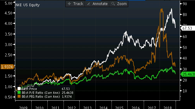 Nike'i aktsia (valge), jooksva majandusaasta oodataval kasumil põhinev PE (roheline) ning PEG (pruun)