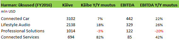 Üksuste lõikes kasvas lõppenud majandusaastal Harmani suurima üksuse, Connected Car, käive +7% Y/Y ning EBITDA +22%. Neljas üksusest ühe, Professional Solutionsi, käive ja kasum vähenesid. Märkusea, 2017. aasta majandusaastal ootab Harman kõikidelt üksustelt käibe ja EBITDA kasvu.