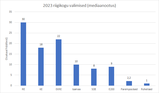 a) Mitu protsenti häältest saavad Riigikogu valimistel suuremad erakonnad? RE 32%, EKRE 22% , KE 18%, Isamaa 10%, SDE 8%, Eesti 200 8%