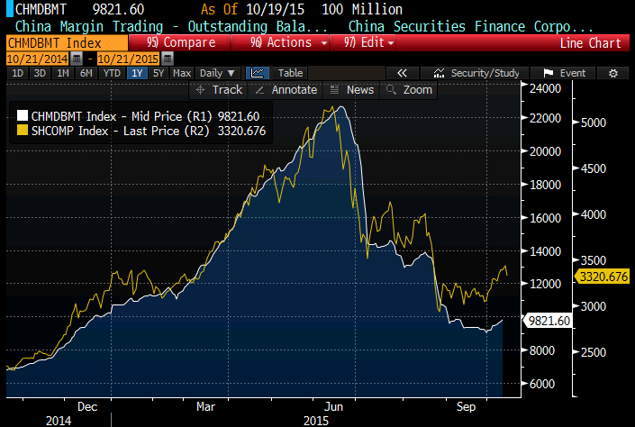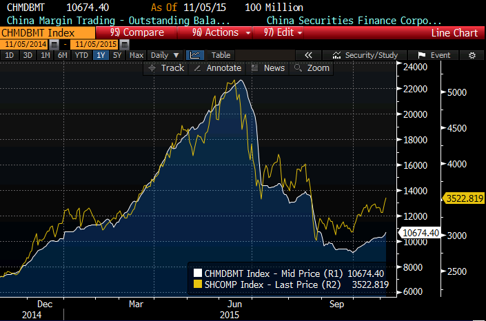 Shanghai Composite (kollane) on saanud uue hoo sisse ning põrganud augusti põhjast 25%. Ülespoole on liikuma hakanud ka võimendus (valge), mis tekitab paratamatult küsimuse, kas aktsiaturu stabiliseerumine loob väikeinvestorite seas taas julgust spekuleerida.