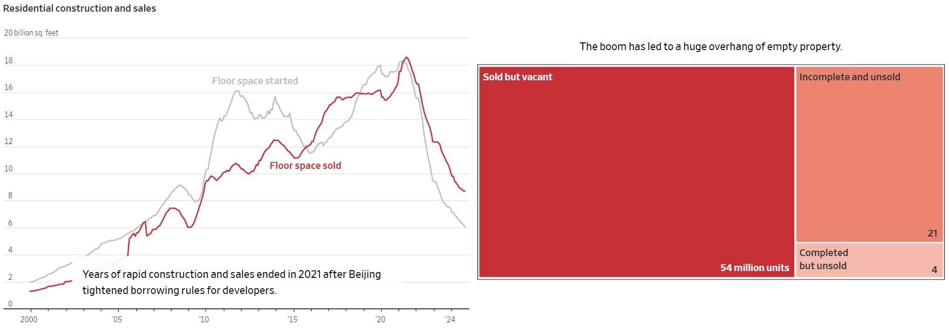 Real estate: China’s real-estate boom was unprecedented, and so is the ongoing bust. New construction and sales have cratered, despite measures to ease purchase restrictions and offer cheap credit to would-be buyers. There are as many as around 80 million vacant units, according to the latest estimates at the end of November, equivalent to half the total housing stock of the entire U.S.