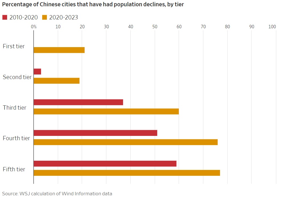 Filling those homes would be hard enough even if China’s population were growing, but it’s not. Because of the country’s one-child policy, it is expected to fall by 204 million people over the next 30 years. The problem is much harder to solve in smaller cities, which often have weaker economic prospects and declining populations. In China, researchers informally group cities into tiers, and many of the nearly 340 cities classified as third-, fourth- and fifth-tier—with populations from few hundred thousand to several million people—are struggling economically. At least 60% of third-, fourth- and fifth-tier cities saw their populations shrink from 2020 to 2023. Those cities have more than 60% of housing inventory, according to Harvard economics professor Kenneth Rogoff. Robin Xing, chief China economist at Morgan Stanley, said China’s government should introduce a more comprehensive bailout that involves buying up excess inventory in China’s 30 to 50 largest cities and turning it into public housing, without worrying about profit. Estimated cost: $420 billion. That wouldn’t include empty homes in third-, fourth- and fifth-tier Chinese cities. Putting more money into those units, many say, wouldn’t make sense because there aren’t enough people to live in them anyway. Rogoff, the Harvard professor, said he believes there will be some cities in which a quarter of the housing is empty. In such places, “it is very hard to maintain law and order, even probably in China,” he said. “I think it’s going to be a big social and governance problem in the future.”