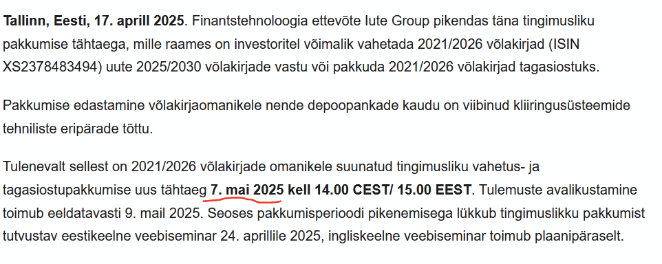 Anname investoritele teada, et Iute 2021/2026 võlakirjade omanikele suunatud tingimusliku vahetus- ja tagasiostupakkumise uus tähtaeg on 7. mai 2025 kell 15.00 EEST. Pakkumisperioodi pikendatakse, kuna pakkumise edastamine võlakirjaomanikele nende depoopankade kaudu on viibinud kliiringusüsteemide tehniliste eripärade tõttu.