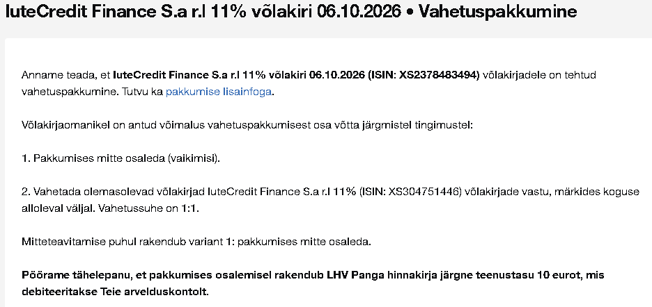 LHV panga vastus:“Tänud kirja eest. Hetkel ei saa LHV ega ka teiste pankade kliendid veel vahetuspakkumisest osa võtta. LHV ootab oma kontohaldurilt instruktsioone, mille järel saavad kõik LHV kliendid, kes on Iute 2021/2026 võlakirjade omanikud, teavituse nii e-kirja kui ka panga teate kaudu. Teade suunab investorid internetipanga korporatiivsete sündmuste sektsiooni, kus on võimalik vahetuspakkumisest osa võtta.”