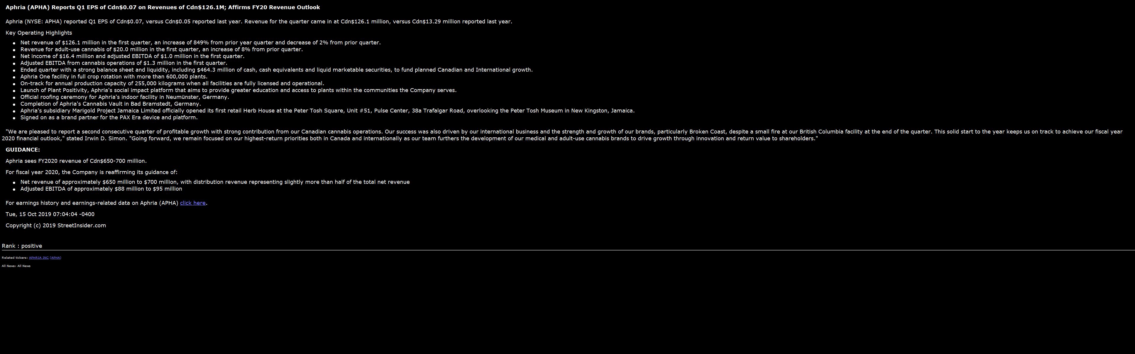 APHA: Aphria up 22% premarket as FQ1 income beats consensus
