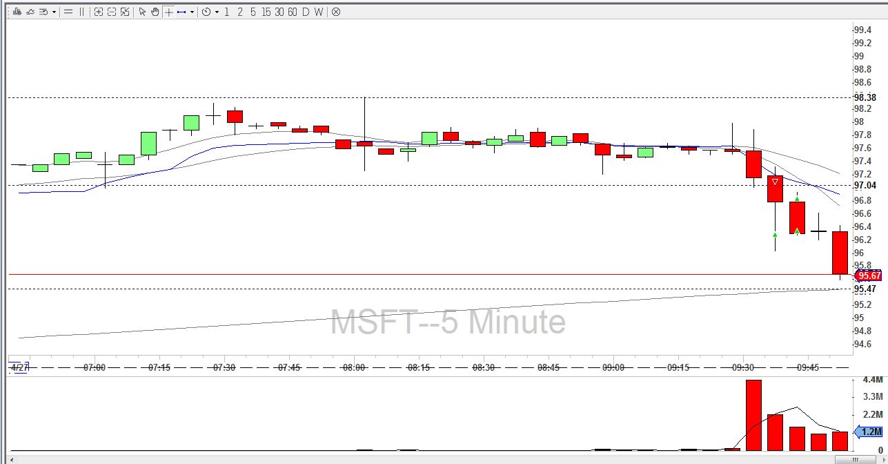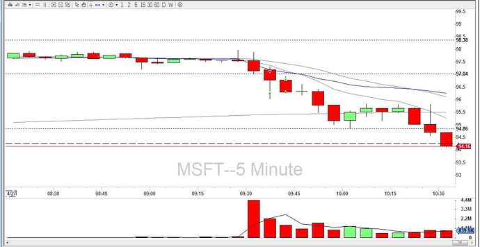 seejärel läksin finviz.com lehele ja vaatasin sealt mis uudise peale MSFT liigub, sealt selgus ,et tal olid just tulnud kvartalitulemused, mis teeb selle aktsia koheselt minu jaoks huvitavaks, kuna tal on "katalüsaator" liikumaks turust erinevalt. Seejärel panin ta oma ekraanile jooksma ning turu avanedes kui esimene 5min. küünal sulgus nägin et ta müüakse suure käibega alla esimese 5min. käive oli 4,4M aktsiat,see näitab tohutut müügisurvet aktsial ja seetõttu shortisin seda tegin n.ö. opening range breakdowni 5min. graafikul see oli ka eelturu taseme murdumine, ning lisaks langes ka spy samal ajal mis lisasid tehingule kindlust. riskisin 1 dollariga (stoploss oli esimese 5min. küünla peal 98 juures) ,et teenida 1,5 dollarit( target oli 95.5 MA20 peal)