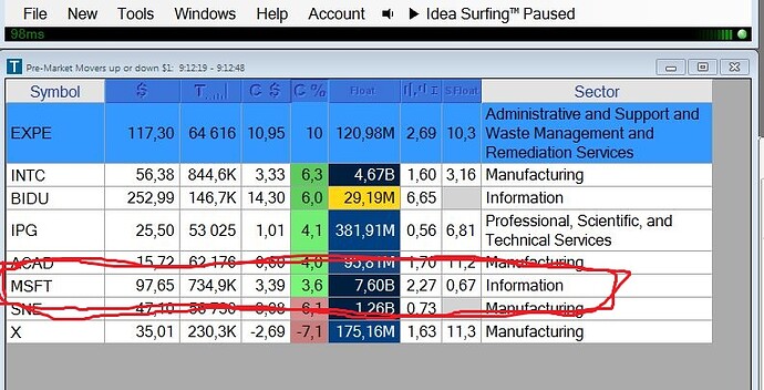 kõigepealt leidsin MSFT trade-ideas scannneri abil tund enne turu avanemist kui ta oli suure käibega 3,6% plussis eelturul: