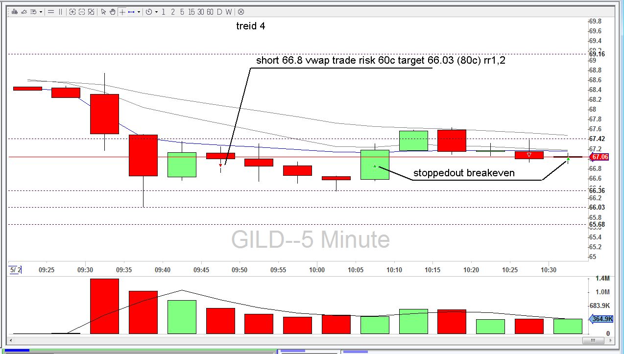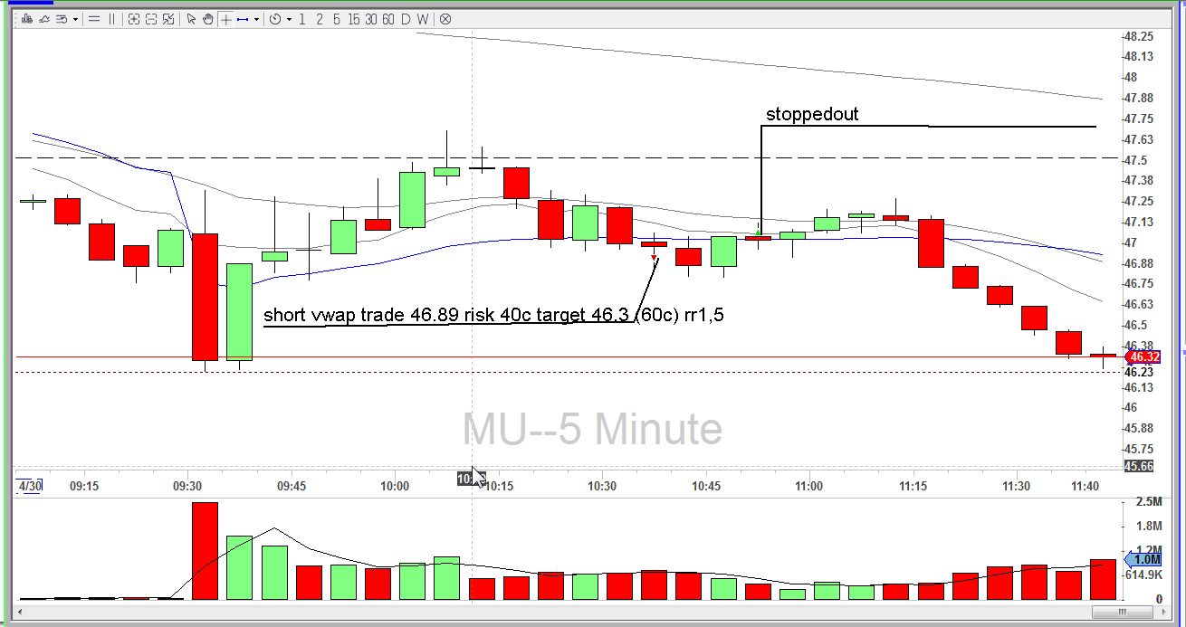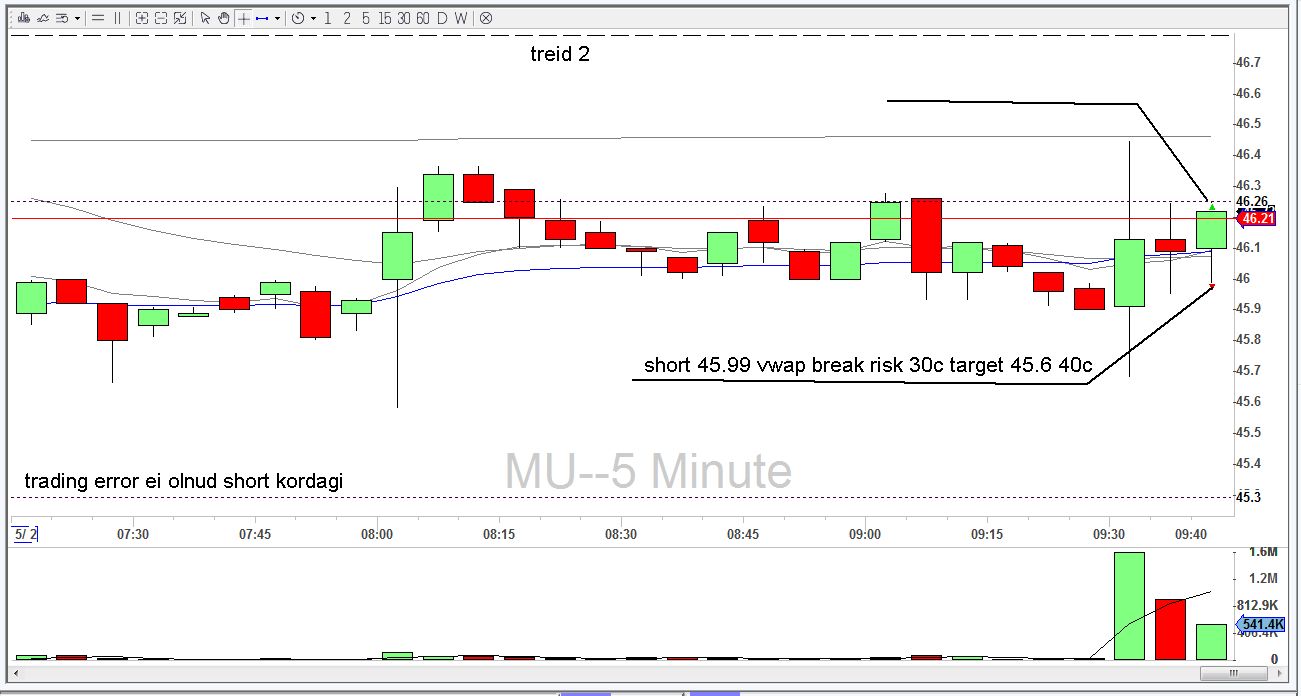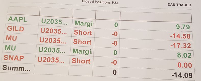 Täna kauplesin ise viletsalt, tegin õiged ostud aga läksin jälle ahneks ning SNAPi ideaalse shordi suutsin 0 ga maha müüa, kuna ei võtnud kasumit. Teise treidi tegin MU shordi mis ei töötanud ja ei olnud ka korralik setup. AAPL ja MU treidil panin konservatiivsemad targetit rr 1/1 kanti ja töötasid ilusti GILD short jooksis ka 50c plussi aga kasumit võtmata lasin ta 0 tagasi tiksuda ja peale seda lõpetasin päeva äea +0,6 riskiga............hiljem aga juba trenni minnes tulin korraks arvuti ette ja täiesti arusaamatul komber hüppasin korraga 2 shorti GILD ja MU mõlemad millega olin lossi alguses saanud ja loomulikult revenge trading ilma korraliku ei tööta ja sain lossid mõlemaga uuesti ning rikkusin ka päeva ära kokku -1,4 riski. Homsest vaatan targeteid konservatiivsemalt ja hakkan kasumit võtma 1/1 pealt...ja jätan väikese osa jooksma kui ei ole scalptrade...