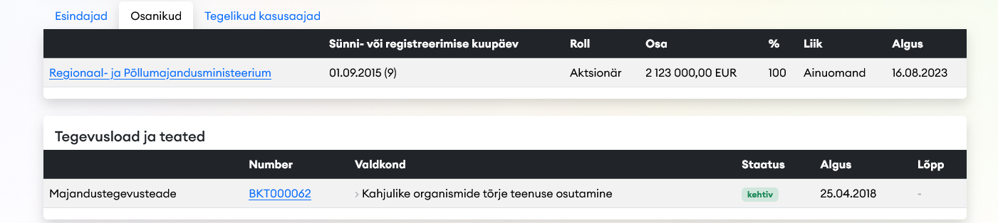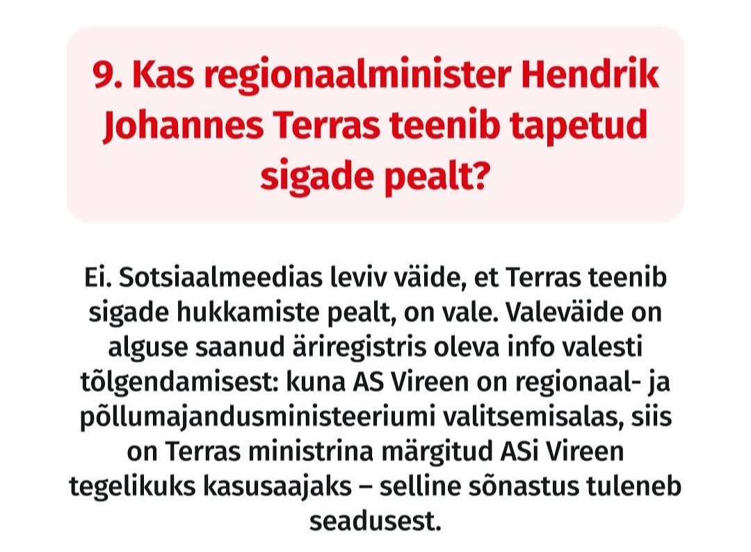 AS VIREEN – ettevõte, mis kogub, transpordib ja hävitab hukatud sead kuulub 100% Eesti riigile ja on maaelu ministri otsehalduses. Registri andmetest selgub, et minister Henrik Johannes Terras on ise kirjas tegeliku kasusaajana, koos tema määratud nõukogu liikmetega.