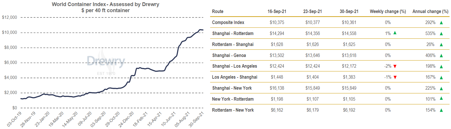 Composite World Container index inched down by 0.2% to $10,360.87 per 40ft container this week, but remains 291.8% higher than a year ago. Avg composite index of the WCI, assessed by Drewry for year-to-date, is $6,977 per 40ft container, which is $4,547 higher than the five-year average of $2,430 per 40ft container.