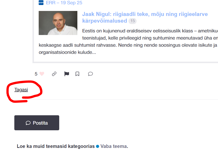 Võiks üldse ära kaotada. Seal allpool on niikuinii link “Vaba teema” vms peale ja tagasimineku funktsionaalsus on töökindlana olemas brauseril. Hetkel lihtsalt põhjustab kogemata klikke ja siis kirumist