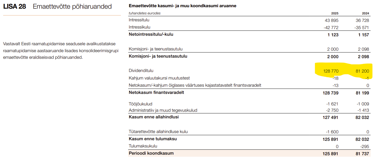 Mhm, tegu on tütardest Gruppi kantud dividendidega. Aga faktiraamatu kvartaalsete puhaskasumite plokis saaks “LHV Group (eraldiseisvana)” real näidata tegelikku Grupi soolo tulemust ilma, et investorid aruannetest numbreid otsima ja liitma-lahutama saata. Või kui peab, siis näidata edasi nii nagu täna, aga lisada sinna tärniga juurde, kui suur dividenditulu tuleks soolo tulemuse jaoks maha arvata.