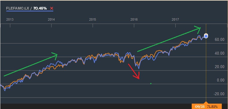 See ei ole ehk kõige parem graafik, aga umbes nii läheb aktiivsetel fondidel - sinine joon on end S&P500 vastu mõõtev aktiivne fond